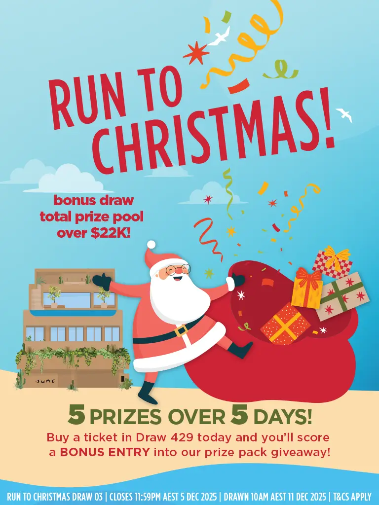 Draw 430 is your chance to own the ultimate happy place, for only a $5 ticket. Why wouldn’t you?Closes: 8pm (AEST) Wed 25 Feb 2026. Drawn: 10am (AEST) Wed 4 Mar 2026. T&Cs apply.