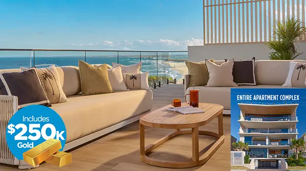 Live like royalty in your own $15.5 million Sunshine Coast Kingdom. This entire coastal tower overlooking Kings Beach includes four luxury apartments, a rooftop terrace with 180-degree ocean views and $250K in gold included. The record-breaking Draw 432 is Australia’s biggest prize home draw. Ever. And it could be yours for only $10 a ticket!