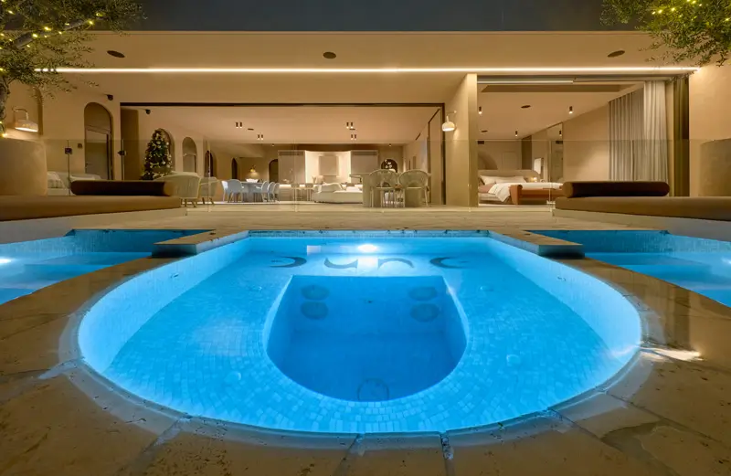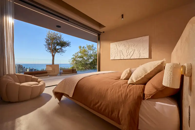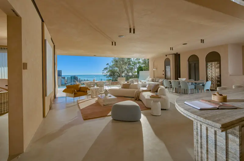Expansive glass doors frame ocean panoramas, allowing natural light to dance across organic textures woven throughout the home. From the freestanding travertine bath to coral-inspired lighting and flowing silks that catch the sea breeze, every detail has been chosen to enhance ‘Dune’s’ stunning coastal setting.