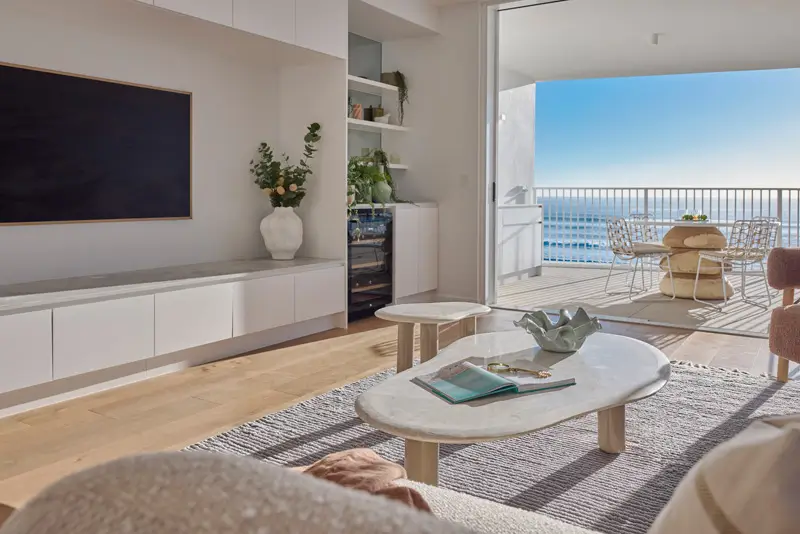 Inside, light floods through full-height windows, framing the ocean beyond. European appliances and elegant finishes make every space feel refined yet effortless.
