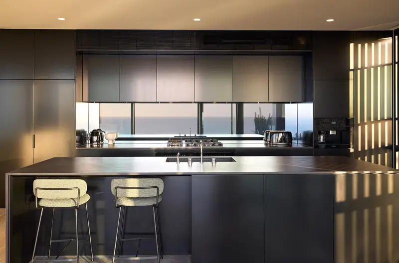 This 3-bedroom designer home in Mount Martha combines contemporary architecture with uninterrupted Port Phillip Bay views. Thoughtfully designed by Intermode, the home offers clean lines, floor-to-ceiling glass, and a mirrored splashback that reflects the sea from within the chef’s kitchen.