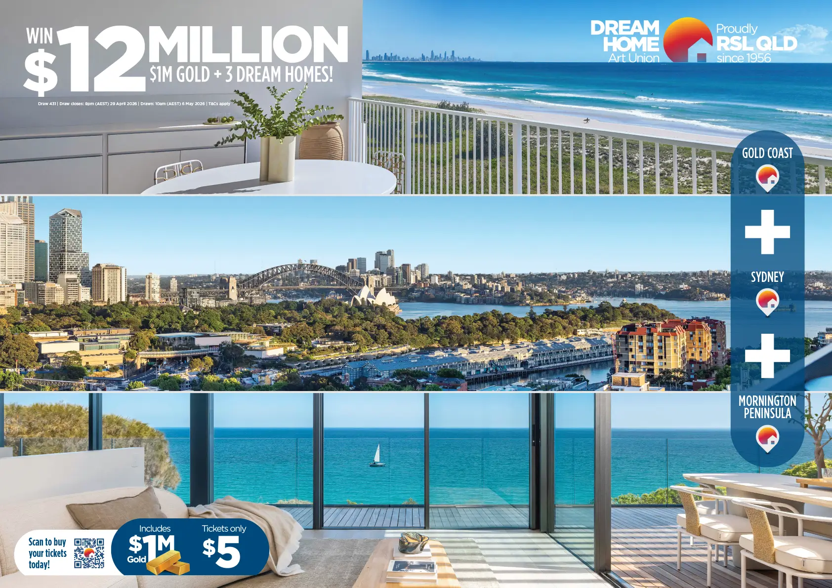 And if you’re lucky enough to win the Dream Home Art Union Draw 431 - A $12 Million East Coast Triple prize package, you'll have the chance to own a Mornington Peninsula dream home to enjoy the best of Victorian coastal living PLUS a Gold Coast dream home PLUS a Sydney dream home, and $1 Million worth of gold!Three dream homes, three coastlines, one extraordinary prize, all for just a $5 ticket. Secure yours and start dreaming right now!