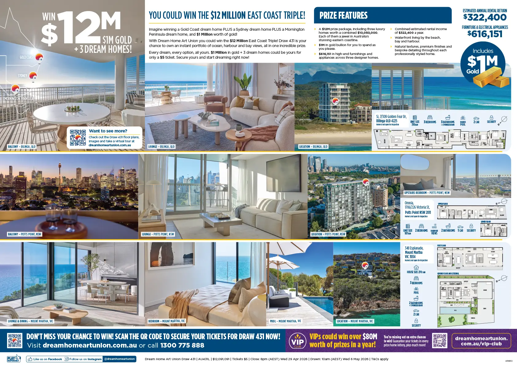 Dream Home Art Union Draw 431 presents the $12 Million East Coast Triple – an extraordinary portfolio of three dream homes along Australia’s most iconic coastal settings. With $1 Million in gold bullion included, this prize isn’t just about homes – it’s a complete shift in how you could live.
