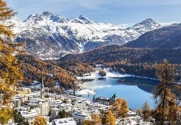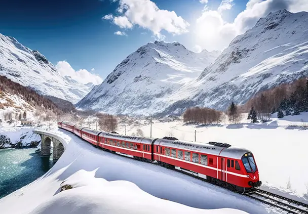- First class Bernia Express rail through Swiss Alps to St Moritz Switzerland